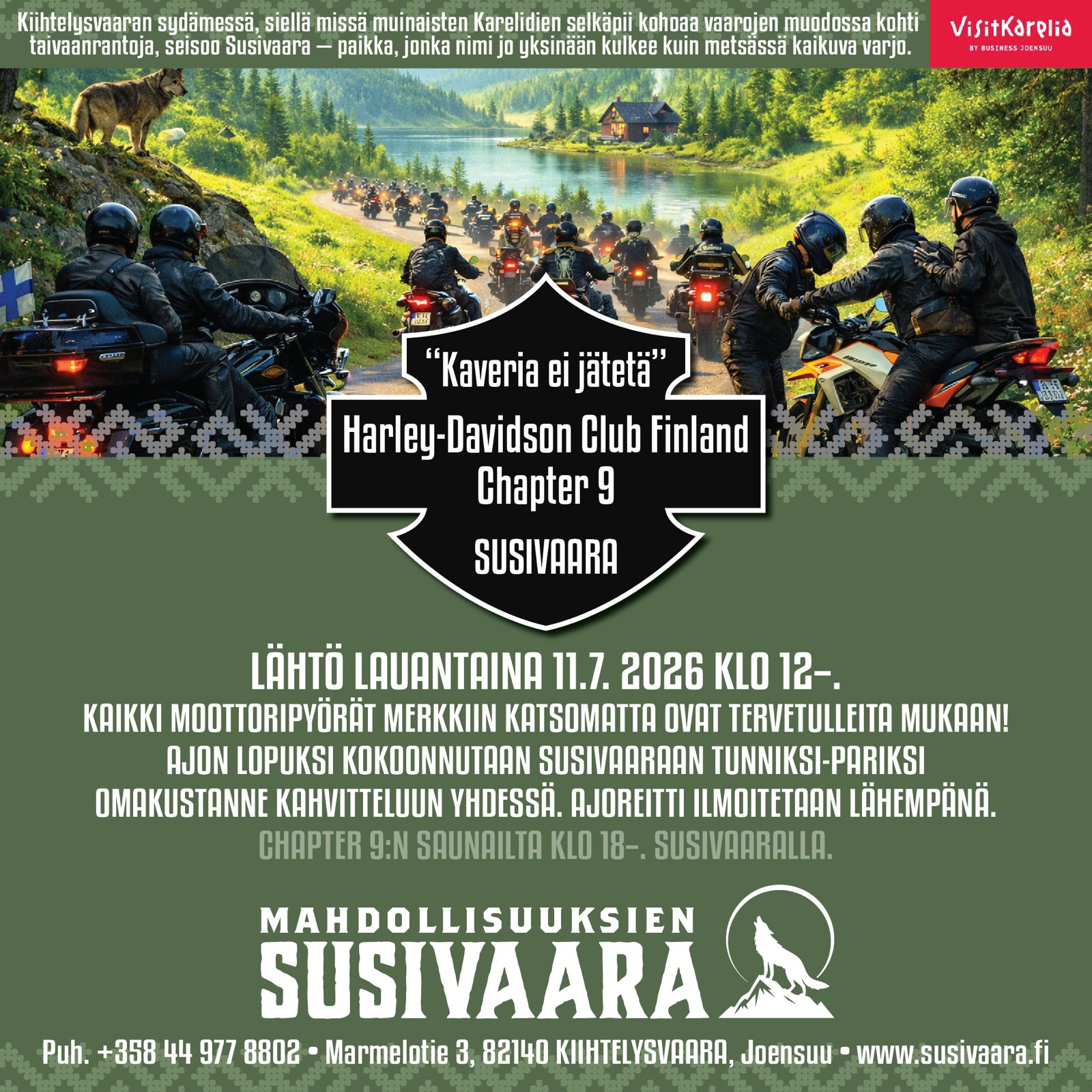 KAVERIA EI JÄTETÄ AJO - H-DCF CHAPTER 9 - SUSIVAARA KAIKKI MOOTTORIPYÖRÄT MERKKIIN KATSOMATTA OVAT TERVETULLEITA MUKAAN! Jokainen osallistuu omalla vastuulla. Ajon lopuksi kokoonnutaan Susivaaraan kahvitteluun yhdessä. Lauantaina 11.7.2026. Lähtö klo 12-