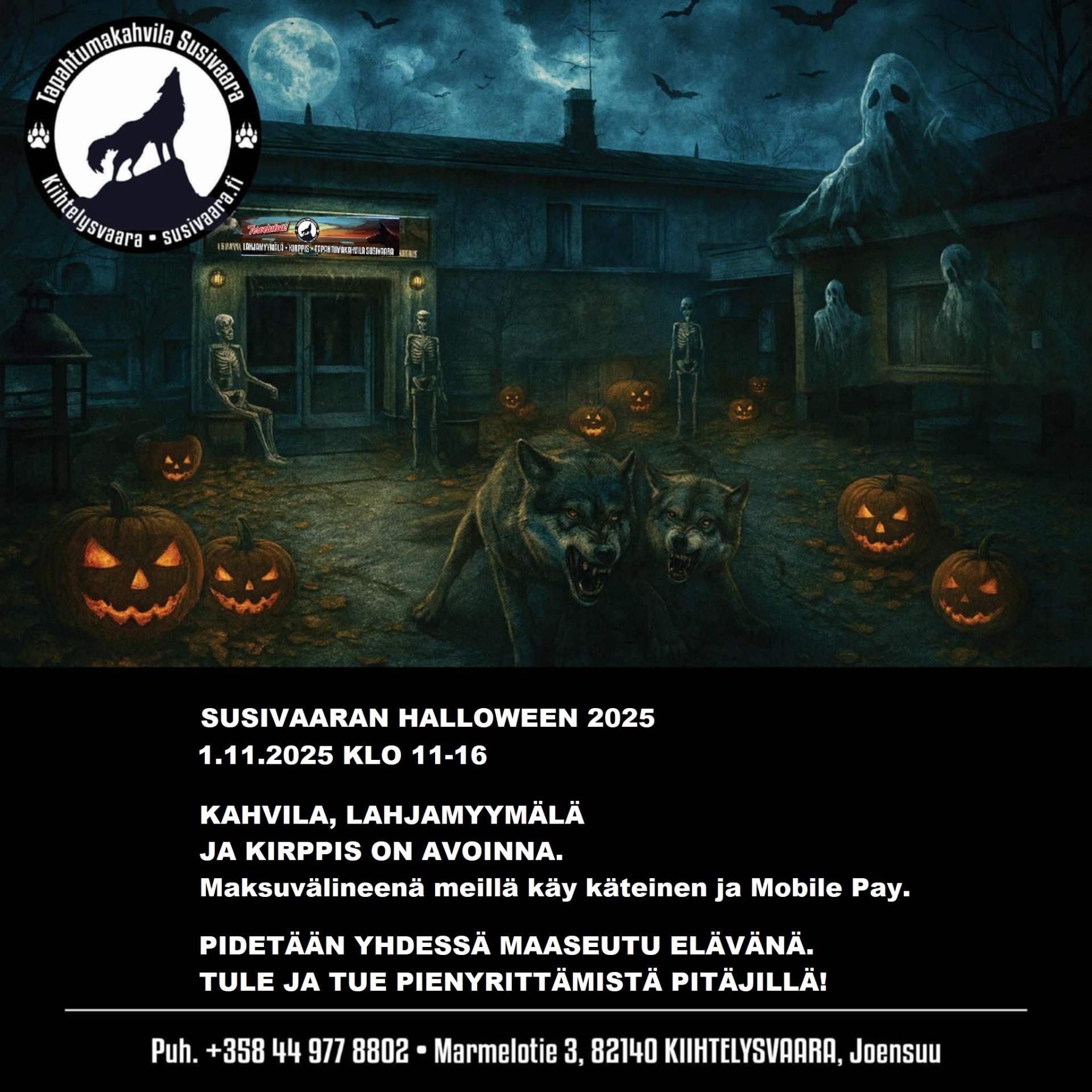 SUSIVAARAN HALLOWEEN 2025 LAUANTAINA 1.11.2025 KLO 11-16 KAHVILA, LAHJAMYYMÄLÄ JA KIRPPIS ON AVOINNA. Maksuvälineenä meillä käy käteinen ja Mobile Pay. TERVETULOA SUSIVAARAAN! susivaara.fi PIDETÄÄN MAASEUTU ELÄVÄNÄ.