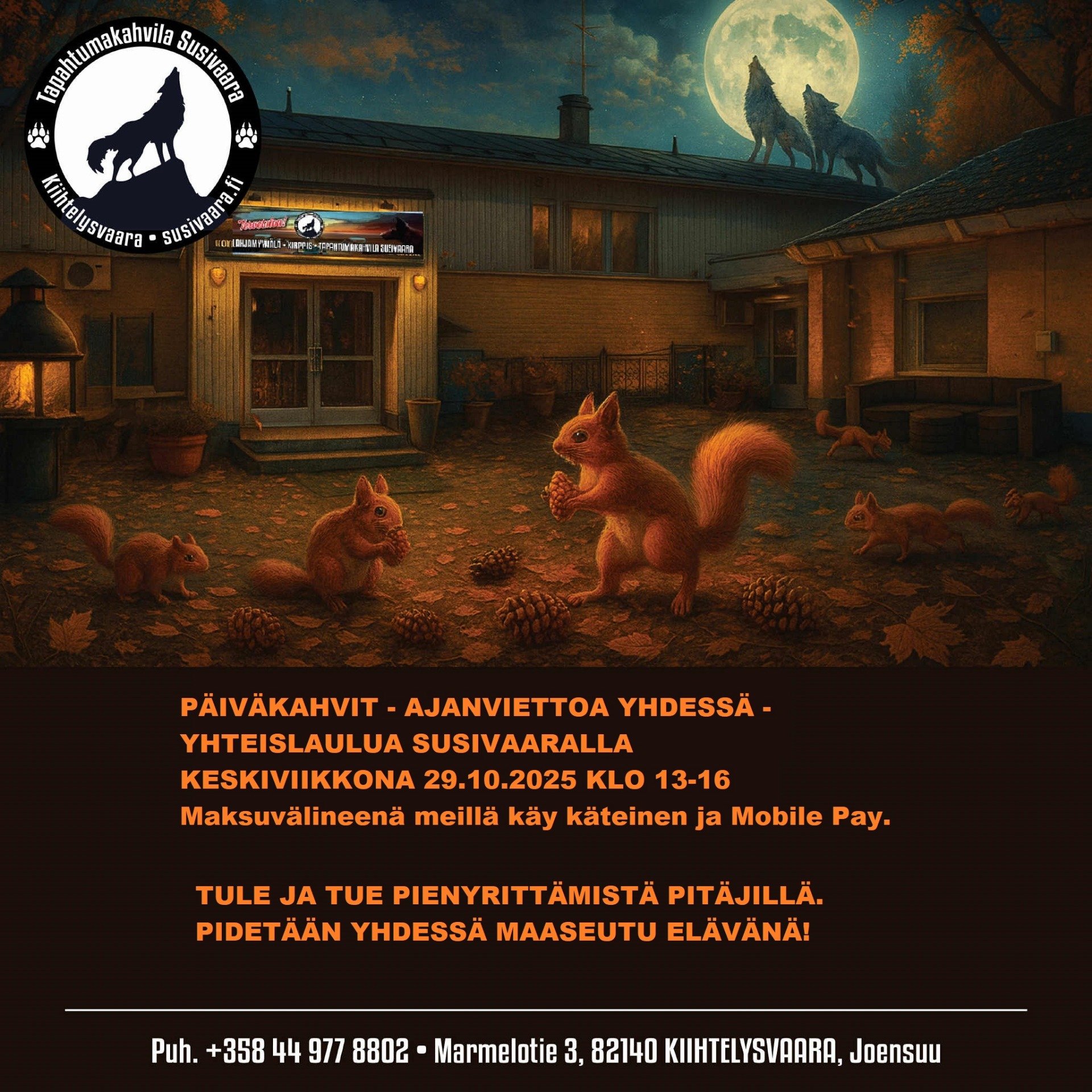 PÄIVÄKAHVIT - AJANVIETTOA YHDESSÄ - YHTEISLAULUA SUSIVAARALLA KESKIVIIKKONA 29.10.2025 KLO 13-16. TERVETULOA MUKAAN! KAHVILA, LAHJAMYYMÄLÄ JA KIRPPIS ON AVOINNA.