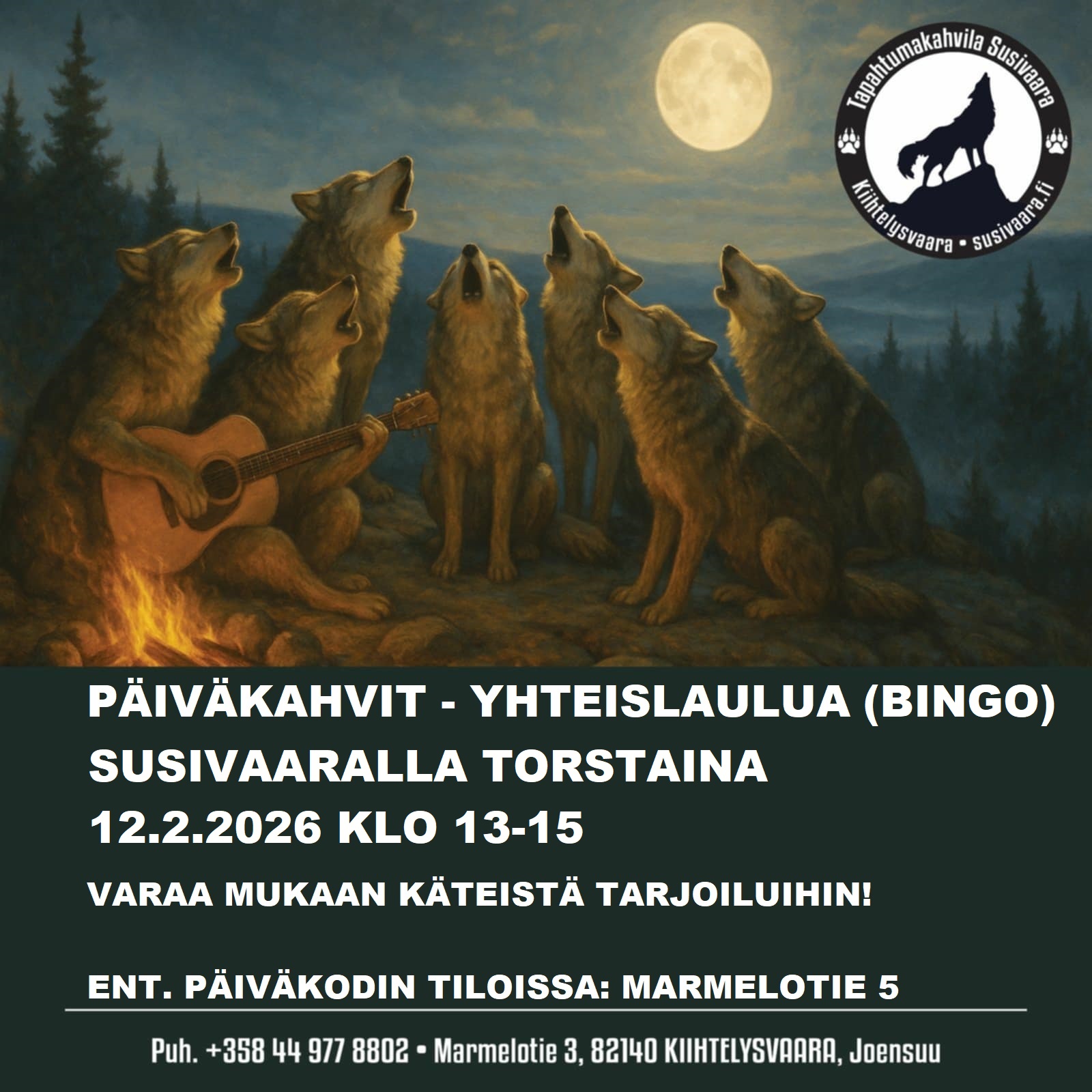 PÄIVÄKAHVIT JA YHTEISLAULUA (BINGO) SUSIVAARALLA TORSTAINA 12.2.2025 KLO 13-15. VARAA MUKAAN KÄTEISTÄ TARJOILUIHIN! Os. Marmelotie 5, Kiihtelysvaara.